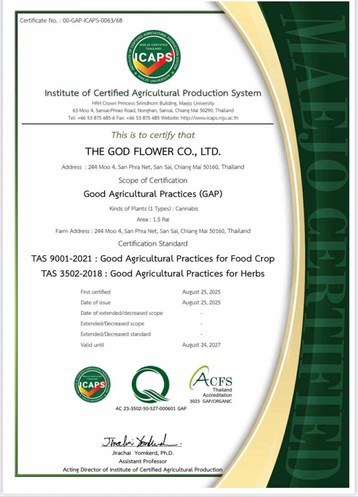 The God Flower is now officially certified with Good Agricultural Practices (GAP) for cannabis cultivation.